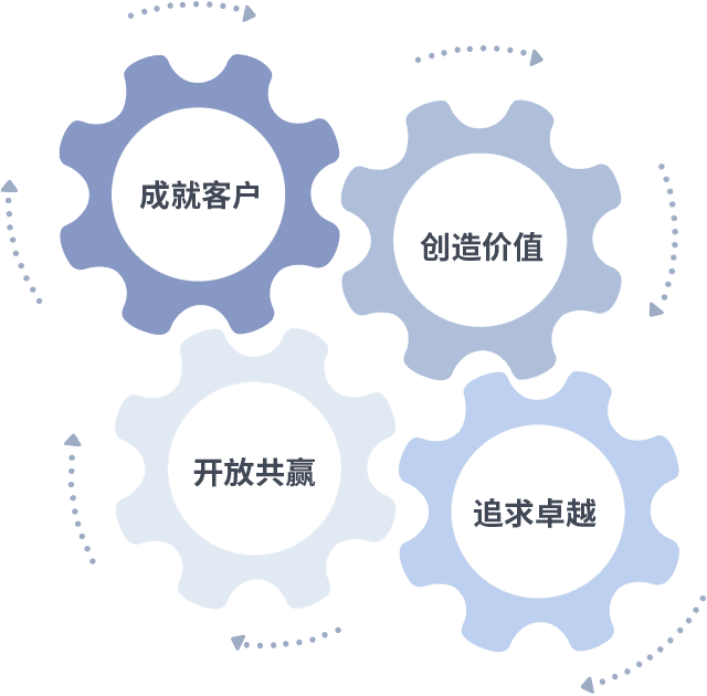 成就客户是一切决策的出发点,,,创造价值是衡量所有工作的标准,,,追求卓越是我们做事做人的态度,,,开放共赢是我们的格局也是最终的结果。。价值观的齿轮环环相扣,,,推动着组织里的每个人不断向前。。