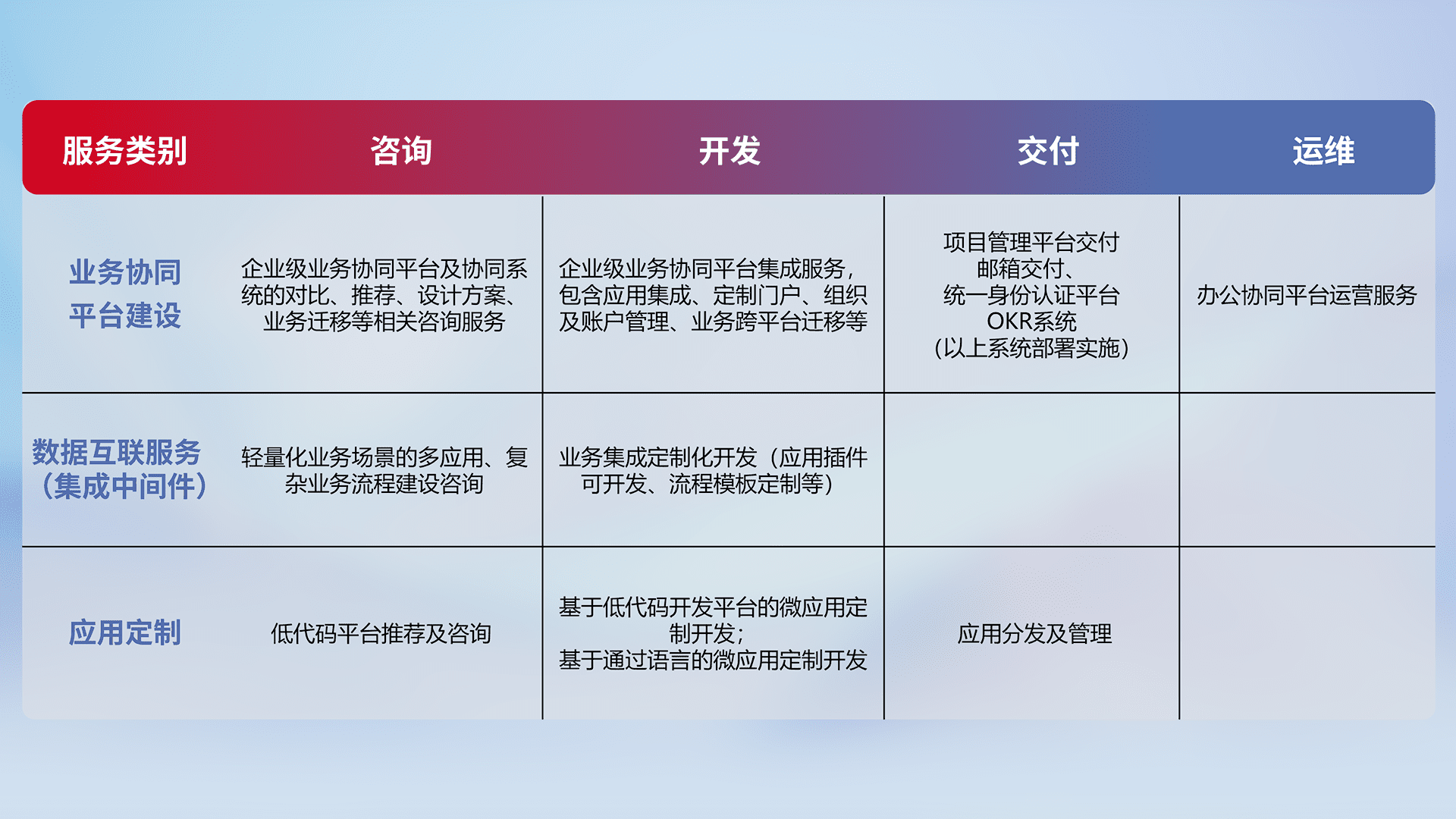 针对钉钉、、、企微、、IDaas等平台级产品提供产品的规划、、、方案、、、、交付、、、、定制化开发等服务,,,,实现如统一协同办公、、、智能客户服务、、混合会议管理、、、智能数据查询、、、等业务场景,,实现数字化转型。。。。