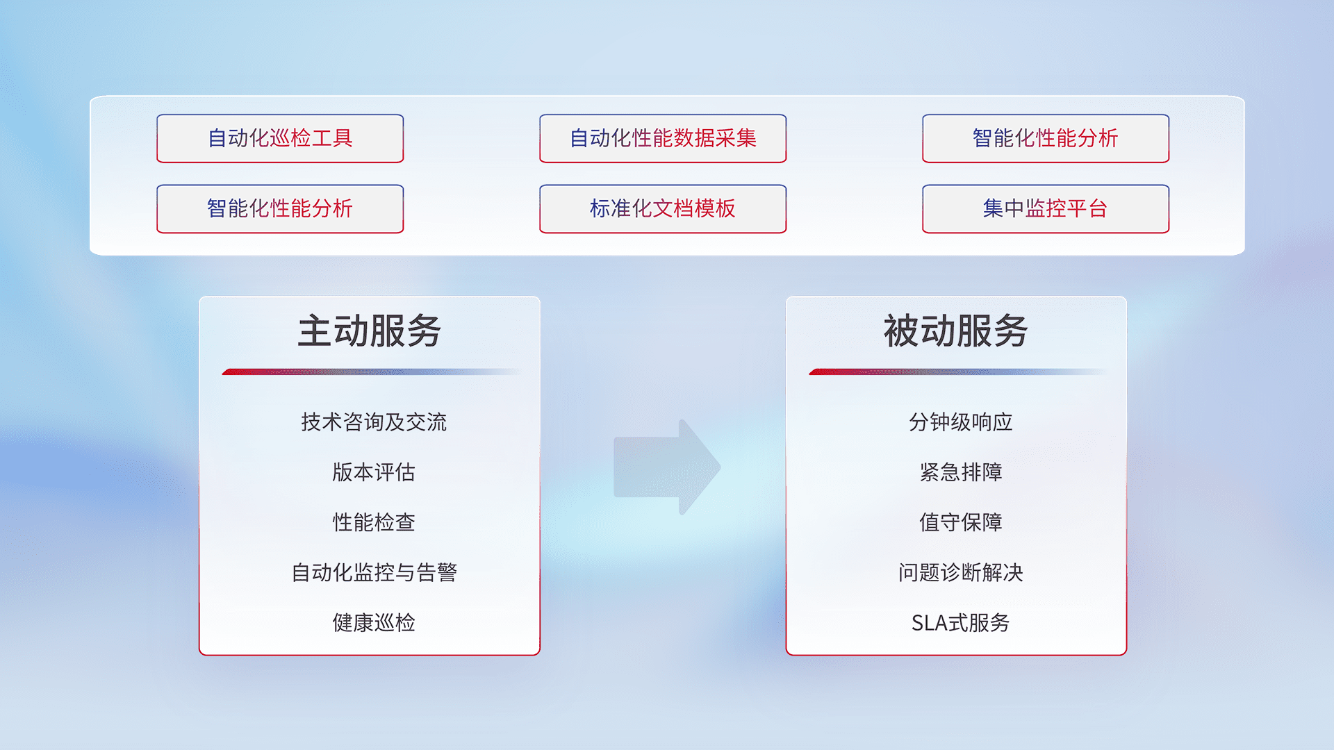 智能化工具和标准化文档,,,,保障服务质量,,提供主动服务(包含技术咨询、、版本评估、、、、性能检查、、、自动化监控与告警、、、、健康巡检)和被动服务包含(分钟级响应、、、、紧急排障、、、值守保障、、、、问题诊断解决、、、SLA服务)。。。。